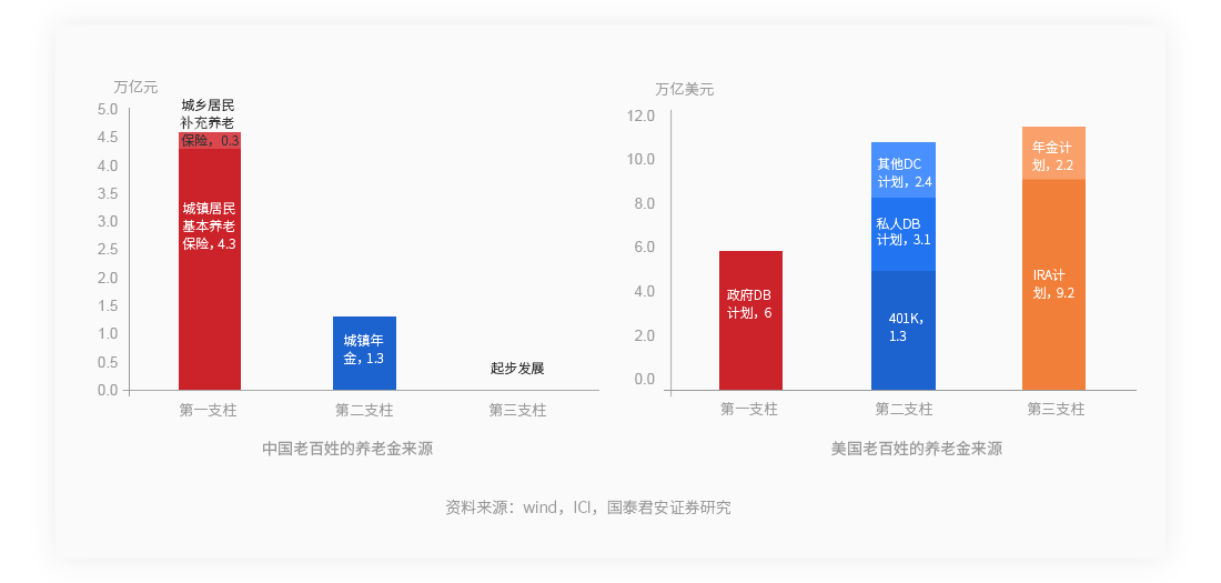中国人养老主要靠国家和企业两大支柱(养老保险及年金),美国人养老比中国人多了一个支柱,个人养老金投资账户,有助于提升退休后的养老生活水平。