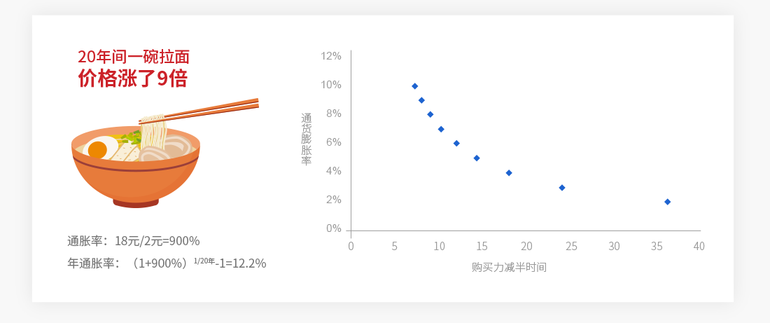 通货膨胀正在吞噬着我们养老金的购买力。如果现在养老需要100万元,假定3%的通货膨胀率,24年后养老花费将达到200万元。现实中通货膨胀的例子,20年前买一碗拉面只需要2元,现在需要18元价格涨了9倍。